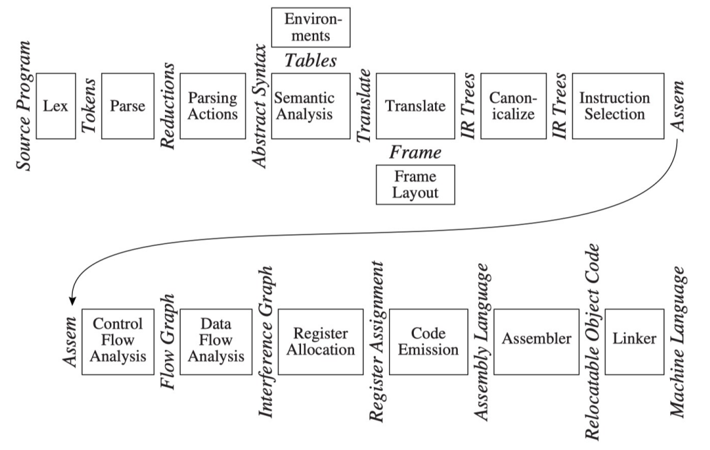 上图是教材中一个典型的编译器的模块和接口,尽管主流编译器可能有差异,但是总体的阶段和接口是通用的。