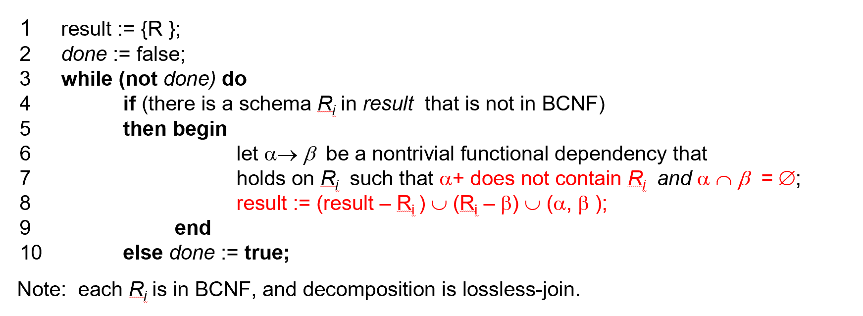 - Each attribute A in \(\beta - \alpha\) is contained in a candidate key for \(R\)